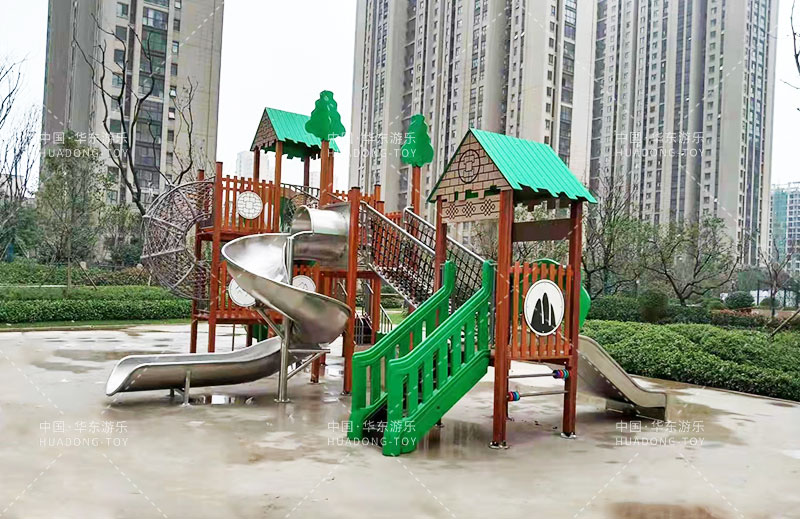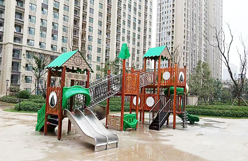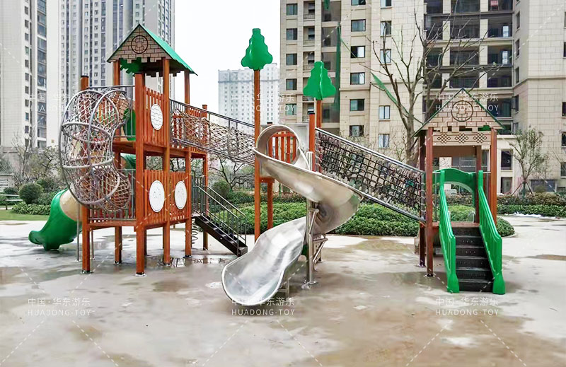 荣盛华府选用的是乐鱼体育游乐自主设计的具有攀爬网、U型爬网、不锈钢滑梯、网桥、滑桶为一体的综合性游乐设备。