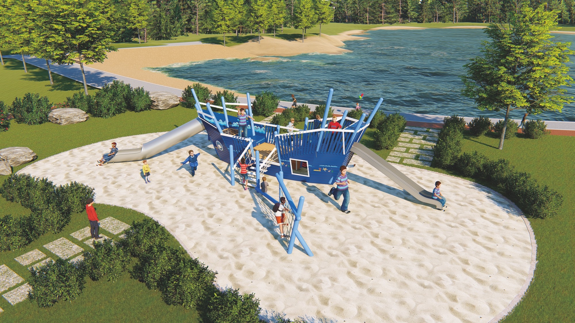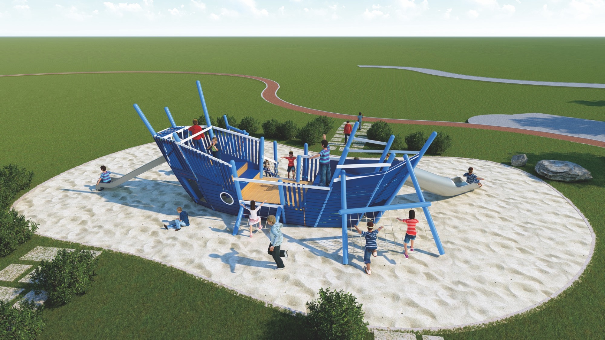• 木质海盗船组合滑梯的设计以大自然为主题,融合了船体、桅杆、甲板等元素,外观新颖、结构牢固。它集攀爬、滑梯、秋千等功能于一体,旨在锻炼孩子的平衡协调能力和自我保护意识,同时培养探险精神。
